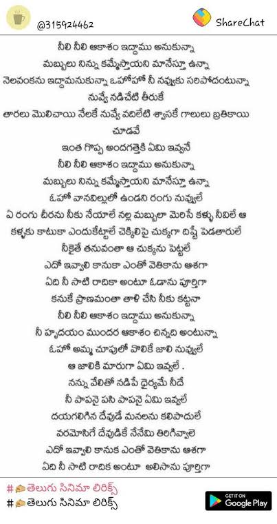 Neeli neeli akasam song lyrics Telugu